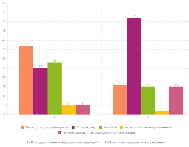 Записаться на прием в государственное медучреждение людям проще на сайте или лично, в то время как ситуация с частными учреждениями принципиально иная: там это делают преимущественно по телефону. На прием к частному врачу записывается по телефону каждый второй, а к государственному только каждый четвертый.