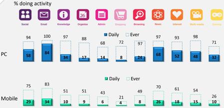 Как видно из рисунка 4, электронная почта (параметр e-mail), т.е. коммуникация посредством переписки сохраняет свои позиции, причем, не только «потенциальные» (ever, когда-либо), но и в ежедневной практике. Данные относятся к России, но сравнение с аналогичными глобальными данными (см. выделенную пунктиром строчку внизу) показывает, что мы находимся «в тренде», скорее даже несколько опережая события, чем отставая от них. Так, по уровню ежедневного использования социальных медиа и электронной почты российские показатели выше глобальных.