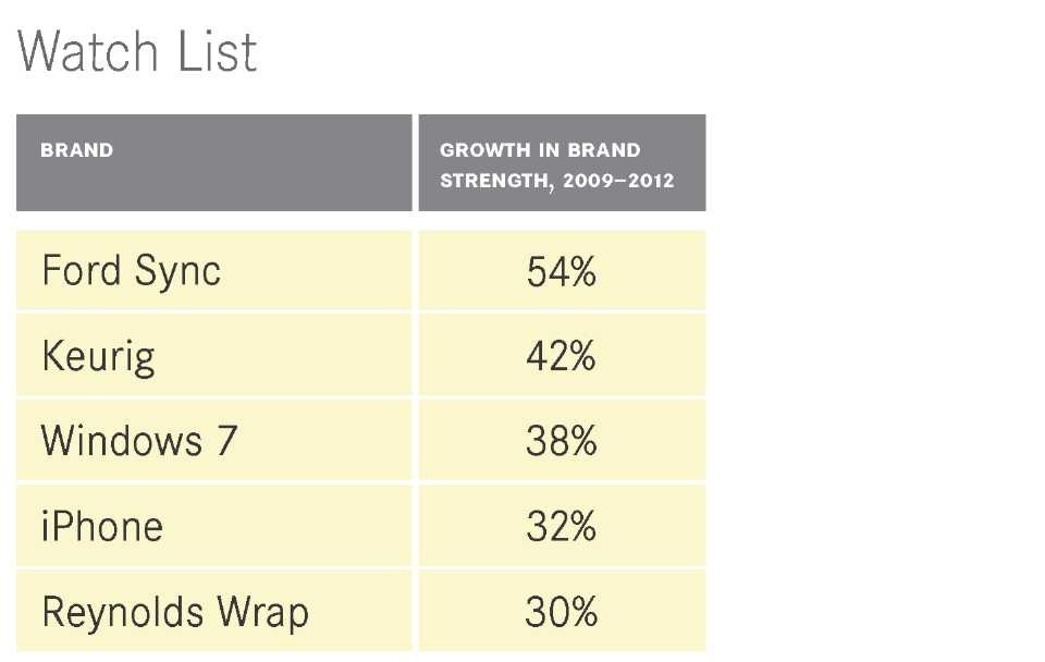 Чтобы ответить на этот вопрос, посмотрим на другой рейтинг, итоги которого, кстати, еще не публиковались в русскоязычной прессе. Это вышедший в сентябре рейтинг Breakway Brands 2013, составляемый компанией Landor (отчет по этому рейтингу за 2013 год можно скачать внизу этой статьи - R&T). Этот рейтинг составляется с 2004 года по разработанной агентством Young & Rubicam методике BrandAsset® Valuator (BAV), основанной на опросах потребителей. Но главное его отличие от упомянутых выше рейтингов в том, что в конечном итоге, оценивается не стоимость брендов, а изменение силы бренда за последние три года. Для этого в Landor ежегодно анализируют около 3,5 тысяч брендов из различных отраслей, используя при этом более 17 тысяч интервью с потребителями, оценивая при этом 48 характеристик здоровья марки.